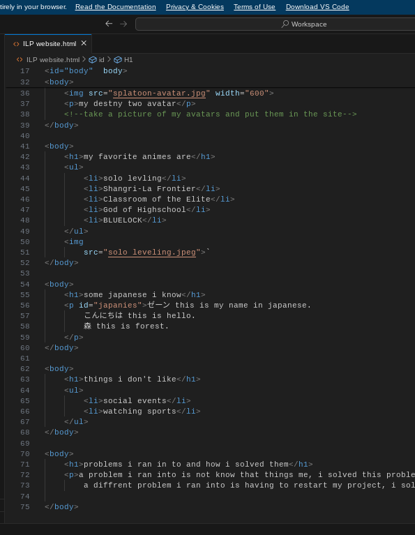 A problem I ran into is not knowing what things mean, I solved this problem by Googling it or asking Camron. a diffrent problem I ran into is having to restart my project, I solved this by just making a new site